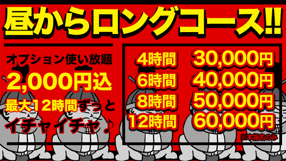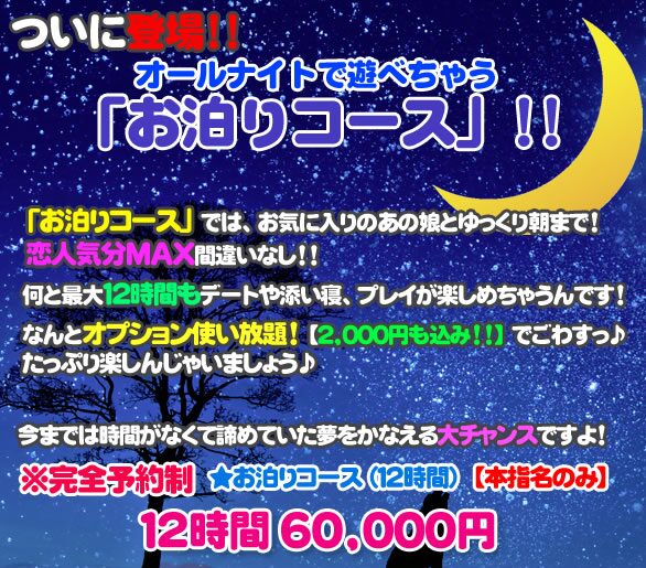 ※ロング&お泊りコースの記載料金は、最安エリアでの料金です。エリア外は別途交通費が発生致します。予めご了承ください。